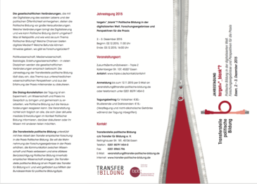 | 15:15 | Neue Medien beforscht – Neuigkeiten für die Politische Bildung? Dr. Helle Becker, Barbara Christ, Transferstelle politische Bildung |