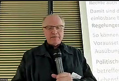 Prof. em. Dr. Benedikt Sturzenhecker (Universität Hamburg) sprach über strukturelle Verankerung demokratischer Partizipation in Einrichtungen der landesgeförderten Jugendsozialarbeit in NRW. Er demonstrierte dies am Beispiel eines Jugendrats im Berufsorientierungszentrums in Ahaus und bezog sich dabei ebenfalls auf das „Integrationsmodell für politische Bildung in der Jugendarbeit“ sowie die von ihm mitentwickelte GEBe-Methode (Gesellschaftliches Engagement Benachteiligter in der Offenen Kinder– und Jugendarbeit fördern), die auch im OPEN-Projekt angewendet wurde.