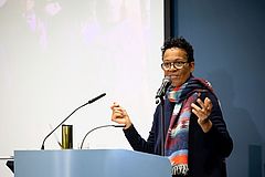 Mo Asumang, eine prominente Stimme im Bereich Antidiskriminierungsarbeit und Antirassismus, sprach in ihrer Keynote über ihre Arbeit als Filmemacherin, Autorin, Moderatorin, Dozentin und Mitgründerin des Vereins Mo:Lab e.V.