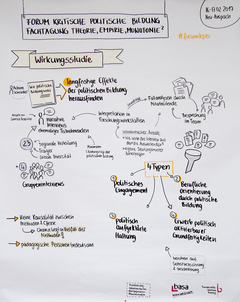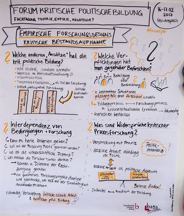Anschließend wurden in Form eines BarCamps verschiedene Themen der kritischen politischen Bildung diskutiert. Die Transferstelle politische Bildung kam mit interessierten Teilnehmenden in zwei Sessions zusammen. Hier ging es zunächst um eine Bestandsaufnahme der Forschung zur politischen Bildung sowie deren Bedingungen. Daran anknüpfend wurde darüber diskutiert, welche Voraussetzungen Forschung aus der Perspektive einer kritischen politischen Bildung erfüllen sollte. In den Sessions wurde darüber diskutiert, welche Möglichkeiten es gibt, die Praxis politischer Bildung in die Forschung einzubinden, welche Form von Verantwortung gegenüber den beforschten Personen besteht und wie Themen, die gesellschaftlich nicht thematisiert werden, in die Forschung mit einbezogen werden können. Weitere Sessions beschäftigten sich u. a. mit den theoretischen Voraussetzungen für empirische Forschung und deren Bedingungen.
